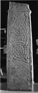 B (narrow): The head appears to be plain above the moulding. An irregular knot pattern fills the upper half of the stone with a horizontal grooved moulding at its base. The pattern is composed of two long diagonal closed circuit loops, which are in three places interlaced and linked by a free ring. The spaces between the rings are filled by a shallow pseudo-strand of a ribbon-like type and the strands on either side are clipped together.