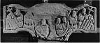 C (broad): In the central roundel, enclosed in a roll moulding, is a baptism scene, as on 5, with the variation that the figure on the left has a halo and is shown with hands clasped across its stomach. Between it and the central figure is a free roundel. The cross-arms have the same pairs of frontal figures as face A; triangular features in relief lie between the inner figure and the roundel.