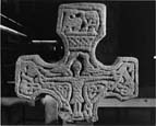 C (broad): In the centre of the head enclosed in an irregular circular roll moulding is a quadruped with its front leg raised. It has long jaws, a pointed ear, a long limp tail and its body is patterned by a series of concentric incisions. Behind it is a shafted cross (head, type A6), which is set in a rectangular base with grooved mouldings (as on 6). Above the back of the animal is a circular feature with a small central depression. On the horizontal arms are two registers of simple pattern E with a space-filling pellet between the outer pairs. In the upper arm is a composition of two canines. Their tails join in a knot; their ear extensions cross their bodies and interlink their pointed front legs, while their back legs coil up and over their bodies. The details of their heads are indistinct. In what is left of the lower arm is the upper half of a composition in which an animal with a canine head struggles in the coils of a snake whose jaws grip its ear.