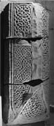 The ridge consists of the bodies of two ribbon animals, whose necks divide to form a `gabled' end. The heads project into each corner beyond the double roll mouldings framing panels of interlace which decorate the shallow `eaves' of the monument.