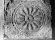 A (broad): Surrounded by a triple moulding: the innermost is a fine roll moulding, the outer ones, which become increasingly wider, being chiselled flat. The mouldings are almost obliterated at the top and on the right side. Filling the panel is a compass-drawn rosette. The centre is built up around a grooved boss surrounded by closely packed veined petals. The thirteen outer petals are deeply scooped and divided by incised lines.