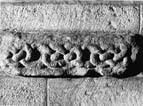 A (long): A flat-band moulding encloses an interlace pattern in which three Carrick Bends (three registers of simple pattern F) are separated by irregular glides.