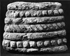 The piece seems to be trapezoidal, and the 'bottom'(?) is smoothly dressed. The `top'(?) or narrowest section is rough and possibly broken off. The ornamental zones run round all four vertical faces, and this seems to be a complete section of ornament. At the top and bottom are rows of heavy pellets, and at the centre a single cable; the pellets and cable are divided from each other by plain heavy roll mouldings.