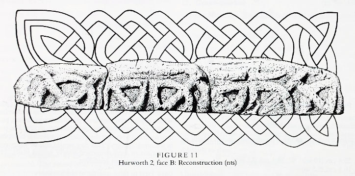 This seems more likely to be a grave-cover than a base and in type resembles the deep slab from Gainford (no. 23). Two attempts have been made to make a reconstruction (Morris 1973; Adcock 1974). Although the patterns are very similar, Adcock's reconstruction has been adopted here (Fig. 11). These widely spaced plait patterns are a feature of carvings of the ninth century and this piece is comparable with sculpture at Ripon and Hauxwell, Yorkshire, and Waberthwaite, Cumberland.