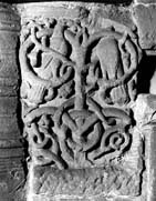 Part of a frieze with a scroll inhabited by two birds. Framed at the top by a flat-band moulding and with a plinth at the base roughly hacked, possibly to hold mortar. The plant-scroll is a tree-scroll with tangled tendrils and with strongly marked ridged nodes on the main stem. The tendrils terminate in trilobed berry bunches or composites made up of pointed and horizontal leaves framing berries and, in one instance, a veined and elongated leaf. The stems are markedly thick in relation to the two birds which perch naturalistically on the uppermost volutes. That on the left is shown in profile with one three-toed claw gripping the branch and its beak open to peck at the fruit. Its eye is indicated by a round punch, its wings and tail by curving grooves. The bird on the right is nearly frontal, with both clawed feet gripping the branch. Its head is missing.