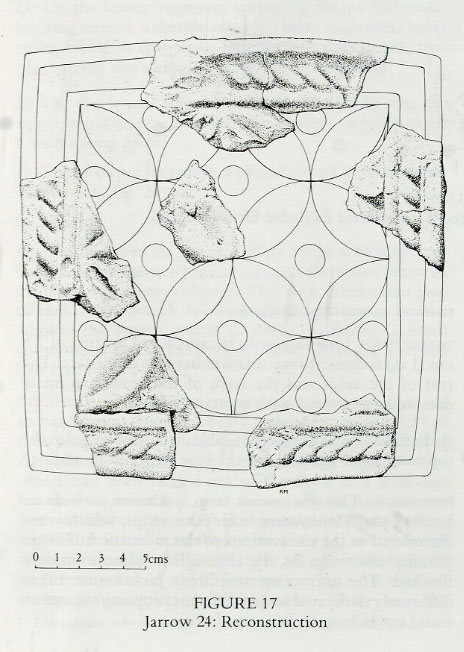 These pieces have obviously been dressed off a carved panel, no doubt in the destruction and rebuilding over the Saxon building. They seem to have formed part of the internal decoration of building A. It is impossible to be certain of the form the panel took. It could have been triangular as the curving sides could suggest, or it could have been rectangular (19 x 20.2 cm; 8 x 7.5 in), as shown in the reconstruction (Fig. 17). If the latter, the slight curve may have accommodated itself to a structural or decorative feature of the building. The decorative scheme of interlinked petals is commonplace in the late antique world (see the Vienna Dioscurides: Weitzmann 1977, pl. xvi). It also occurs in Visigothic Spain (Palol and Hirmer 1967, pl. 17), on Hexham 34 and on a carved pillar from Ripon which could be Roman or early Saxon. It would not be out of place as a decorative plaque on a building as consciously Roman in construction as building A at Jarrow.