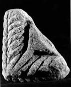 This corner fragment is edged by a double cable divided by an incised line. The lower surface is rough, the upper smooth, and a long projection penetrates the border.