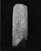 D (narrow): Four panels survive, two incomplete, outlined by a grooved moulding. (i) Interlace which can be reconstructed into two elements of turned closed circuit pattern D with bar terminals. (ii) Plain. (iii) A single fret (Allen 1903, no. 987). (iv) Incomplete single unit of spiralled half pattern A with bar terminal (Adcock 1974, pl.130c).