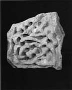 A (broad): Interlace, enclosed in a single roll moulding. In the end of the arm is one unit of double-stranded simple pattern E; part of a second unit, back to back with the first, carries on the design, and could be the same pattern.