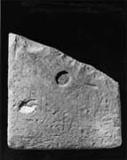A (broad): The only distinct feature is a deep circular hollow which could either be at the end of an arm or more probably the centre of a cross. There appear to be traces of an inscription below but its language and script are uncertain.