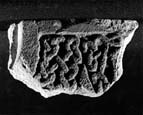 A (broad): The upper plane of the carving is surrounded by a wide flat curving frame edged by a narrow roll moulding. This encloses a curving band of two registers of simple pattern E, and on the right, curving in the opposite direction, are two registers of what are possibly meant to be the same pattern, although the terminal at the right ends in a single loop. The lower plane of the stone has been broken but is dressed.