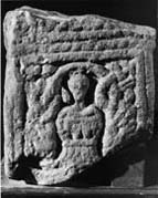 A (broad): Above the figures panel is a composite moulding with pellets, roll, and rough cable. Below is a frontal figure standing under a single arch which sprouts from thick tangled uprights. The figure has an egg-like head, rather rounded shoulders and is dressed in a short belted tunic. He holds a book against his chest. There could be a bird on his right shoulder.