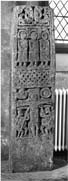 D (narrow): This west face is divided into three panels by grooved horizontal mouldings. (i) Part of a panel of eight-strand plain plait. (ii) A figure crucified upside down. His stiff frontal posture is the same as the other figures on the shaft, as is his head type and clothing. His outstretched arms cannot accommodate themselves easily to the narrow panel, so that the shoulders and large hands run into each other. (iii) A larger scale panel with two S-shaped ribbon animals. Each has one front leg upraised and one back leg passes through the mouth of the other. Their ear extensions pass over and under their bodies, twisting in a triangle and a diamond between them, and become the tail extensions of the opposing beast. Their lips are twisted, their bodies are lightly double-outlined, and their eyes are lentoid.