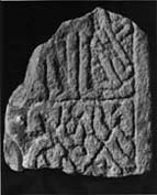 A (broad): The remains of two panels in punched and grooved technique, divided by a single irregular line. (i) In the centre a frontal figure with grotesquely elongated legs, feet turned out, and traces of a short skirt. On the left a frontal or half-turned figure with feet turned out and a short skirt. On the right a figure leaning to the side and possibly holding a pole. (ii) A panel with attempted interlace.