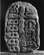 This type of grave-marker is commoner in Durham than in Northumberland (Introduction, p. 7). A particularly close parallel for the cross shape and ornamental formula is Elwick Hall 2. This is the only such grave-marker to attempt a version of the Scandinavian ring-chain pattern.