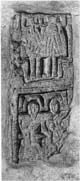 A (broad): Two panels are surrounded by a flat-band moulding. (i) The moulding steps in around the feet of two figures. They are broken off above the shoulders, but appear to be block-like with one common arm. Their hands are clasped in front of them. They wear double-outlined tunics reaching to their knees, with grooved folds. Their feet are frontal. (ii) Two figures have lumpy haloes joined in the centre and terminated in a loose end. Their faces are wedge-shaped with lightly incised features. Their shoulders are carved in one block and they have an arm in common. The one on the left may be clutching a book; the one on the right clasps his hands in front of him. They appear to have girdles which penetrate both their bodies. Their dress is as on i.