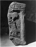 B (narrow): The top part of a band of what may be half pattern A is edged by a narrow flat-band moulding. The central panel is framed by two columnar features which are linked at the base by a convex curve of plain ground. The central panel is deeply cut back and contains a standing cross. The arm types are B11, and there is a circular incision in the centre of the cross-head.