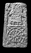 D: The face is divided into three panels by a horizontal cable moulding near the bottom and a plain horizontal moulding nearer the top. Too little is left below the lower moulding to be able to offer any interpretation of the tops of the bold curves that survive there. The top panel contains the lower parts of two figures, probably human. Although at first glance they appear to be playing hockey, it is much more likely that the figures are enmeshed in looped strands of interlace. The feet of the right-hand figure survive; one is pointed forward and the other to the figure's left as if in motion.