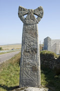 C (broad): This is more worn than face A, particularly in the top half, where only slight traces of the pattern now remain. The cross-head contains a small central boss but otherwise only faint traces of decoration are visible. In the lower half of the shaft, arising from a stepped base above a plain panel, is an acanthine tree-scroll of two registers. It is possible that the plain panel was designed to hold an inscription. The two separate central stalks are bound by a band at the point from which the fleshy curling leaves fall outwards. In the upper part of the shaft, the decoration is too worn for it to be deciphered clearly, but from the faint traces there appear to have been two further registers of double plant-scroll, similar to those in the lower part of the shaft. These were separated from the lower plant decoration by a worn panel which contained some decoration or possibly inscription, now too deteriorated to make out.