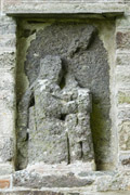 Like St Stephen by Launceston 1, the sculptured panel has a rounded top, suggesting that this may be its original shape. It contains low-relief carvings of the Virgin and Child. The panel is highly eroded and has been defaced, with Christ's head being removed. Mary is seated sideways on a simple chair; no details of her clothes survive (or perhaps were ever carved) apart from a long veil or head-dress hanging down behind her chair. On top of Mary's head is a feature which might be a band holding the veil, but as the sculpture is damaged here it is difficult to be sure. There is no trace of a halo. Mary's sleeved right arm holds the Child and her legs are hidden by the Child, who sits on her lap. Though sadly mutilated, so that very little survives of the head and no halo is evident, Christ is clearly forward facing, leaning in slightly towards his mother. He wears a long, sleeved robe, the hem just above his two pointed feet. Christ's right hand is raised, presumably in blessing, although the individual fingers cannot be seen, while his left hand, which cannot be made out, presumably holds the book which is resting on his left knee. On the right, above the two figures, the Hand of God extends down in blessing.