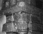 Set of two chancel arch capitals. In situ. Two nook-shaft capitals of the same design set beneath a bold chamfered abacus on a separate stone. They sit above a bold astragal with a double cable-moulding. Above the astragal, the sloping part of the neck is decorated with a row of stiff upright leaves of 'palmette' form. The leaves are scooped out and have rounded tips. Above, the upright part of the neck is divided by a broad band decorated with a cable-moulding. At the angle the capital's volute is represented only by a stiff moulded chevron. Between the angle 'volute' and the edge of the capitals the 'lower abacus' is subdivided into two panels by a vertical fillet, hanging down from the abacus proper and decorated with further cable-moulding. To either side of each fillet the 'lower abacus' is decorated with deeply incised lines radiating downwards from the angle of the capital, where the tip of the volute should be. These capitals are discussed further on p. 71 above.