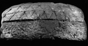 Hogback, type i. A roll moulding marks the slightly curved ridge. On the steeply pitched roof are three rows of tegulation of type 7. Below the overhanging eaves the near-vertical walls are undecorated. The gable ends are vertical.