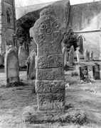 D (narrow): The circle of the head is bound by a raised moulding, but no decoration is now visible either on the circle or on the end of the arm. On the shaft below are five panels, the uppermost, (i), representing a continuation of the circle. There is interlace of an unidentifiable type in (i) and ring-chain derivative (G.I., fig. 26 cv) in the central and bottom panels (iii and v), but the decoration on the collars is no longer distinguishable.