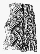 Knowles's drawing suggests that only part of one decorated face survived on the two adjoining fragments. Ornament consisted of a row of what was probably three-strand plain stopped-plait, with interspersed pellets, separated from another row of similar plait by a line of single-branch spiral-scroll.