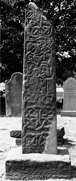 C (broad): At the top are the remains of the moulding marking off the head from the single shaft panel below. The decoration on the shaft is divided by a vertical moulding into two parallel strips of unbalanced interlace, seven registers on the left, and six on the right. The left strip consists of half pattern A turned in various ways with alternation among the lower four and upper three registers. The right-hand strip, which is less regular, is based on turned half pattern A, but with bifurcating strands. There is an upper bar terminal. A small boss (bird's head') decorates a strand crossing towards the top of this strip. There may be traces of the incised body of an animal in the area below the interlace.