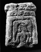 A (broad): An incised horizontal line across the broad moulding at the top of the fragment probably marks the lower border of the panel on the lost head and there are traces of the curve of the arm to the right. Below a second horizontal roll moulding, which continued round the whole head, is a figural scene, bordered above and laterally by yet another roll moulding. At the centre is a figure with hair or halo, standing beneath an arch; the right hand is bent at the elbow and passes in front of the arch.
