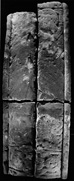 D (long): The panel shape and decoration are as side B though the only termination of the interlace to survive is a tightly curled spiral; the strands are median-incised.