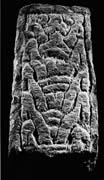 C (broad): Exceedingly worn. The flat edge moulding is also extended across the top of the tapering panel. Within, the design resembles face A's at the base, with the top half of a ring-knot. Above it a whole ring is visible with strands linking it to the element below. At the top there may have been a return loop locked by a transverse median-incised bar. The loose strands at the top take the form of S-shaped fillers and a small volute to an upright triangular element. The strands are broad and flat.