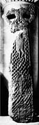 Below this figure the interlace surrounds a long-stemmed cross with slightly splayed arms, type B6. On its surface are faint diagonal marks which align with the surrounding interlace. Within the plaiting at the base is a frontally disposed standing human figure. He stands akimbo, with a round head and pointed chin, and very flat shoulders. On the chest a rectangle is suspended by strands from the neck. Below it are eight vertical incised lines forming a draped 'apron'. The legs are foreshortened and both feet point to the right. The facial features are incised: eyes and nose in a continuous line and a deep slit for the mouth.