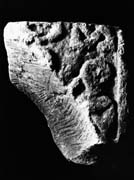A (broad): The edge moulding is flat and survives only on the right-hand side. Within the panel on the right are the remains of the upper half of a human figure with domed brow, pointed chin, and incised facial features in a single line. One shoulder and an arm remain, the hand holding a tapering object. On the left is part of another head.