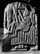 D (narrow): Much of the top of the stone is broken away. The single panel contains remains of two animals from a beast-chain (Fig. 7i). The lower, better preserved beast is in profile with its head thrown back towards its rump. The edges of its body are parallel, though the neck is slightly slimmer. A fetter passes down the axis of the panel crossing the beast's neck and waist, and slipping under the extension of the ear, to divide the body into zones each with its distinct infilling ornament. The head and neck are pelleted, the chest has contouring strips, and the rear quarters strips of cable. The jaws gape and the snout has a triple fold in front of a pellet eye with an encircling ring. The joint of the fore leg is enclosed by two concentric arcs which link with the outer contoured strips, and the fettered leg has a rounded three-toed foot. The waist fetter is median-incised and forms a loose knot below the beast.