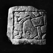 E: The perimeter moulding is broad and flat, matching face A's. It also has fix-point markings. Within the panel is the head of a profile beast with double outline. The head is domed with a small, pricked ear and snub jowl. The incised eye is elliptical. The mouth is a closed slit and from it droops a frondy element. A forepaw has three toes.
