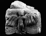 A (broad): There is no edge moulding. A naturalistic, frontally disposed human figure stands with arms outstretched. From them hang crude wings depicted by parallel incisions: each wing has four feathers. The stone is broken away along the left-hand edge. The top of this face is cut back into the stump of a tenon joint.