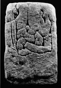 A (broad): There is no edge moulding as such but the carving is inset rather unevenly. The lower part of the stone is undecorated. Two closely locked animals occupy the panel. The canine head of one appears in the lower right-hand corner, a pellet by the snout and a filler by the mouth. The neck is a kindred ribbon but is attached to the crouched torso under which its legs are folded. The knot in the neck is bungled. The other animal is crowded out.
