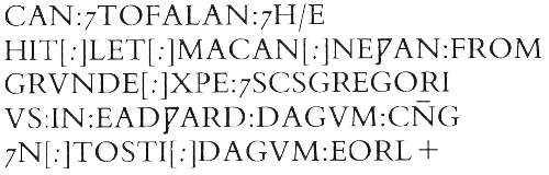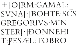 This may be read as: + ORM : GAMAL : SVNA : BOHTE : S(AN)C(TV)S GREGORIVS : MINSTER : ÐONNE HIT : ǷES ÆL : TOBROCAN : 7 TOFALAN : 7 HE HIT : LET : MACAN : NEǷAN : FROM GRVNDE : CHR(IST)E (or CR(IST)E : 7 S(AN)C(TV)S GREGORIVS : IN : EADǷARD : DAGVM : C(I)NG 7 (I)N : TOSTI : DAGVM : EORL +