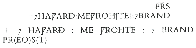 PRS may alternatively be expanded to the Latin PR(E)S(BYTER) (Translation): 'And Hawarð made me and Brand the priest.'