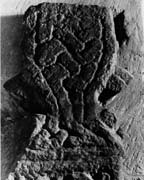 A (broad): The arm-type approximates to type D9. It has a flat perimeter moulding enclosing interlace using broad, flat strands. The pattern seems to have been a form of four-strand plain plait, reducing to two at the narrow part of the arm.