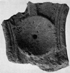 A (broad): Along each edge is a triple roll moulding, of which the outer moulding is the most prominent. These overlap the edge of a dished disc with a central drilled hole. A plain moulding of square section runs from the edge of the disc off the lower edge of the fragment.