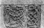 It is rectangular, incomplete, and heavily weathered. There is a narrow border of square section along the upper edge, the remaining edges are trimmed. The face is decorated with an irregular interlace from which develops a three-element leaf. The lower part of the decoration is weathered away.