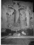 This is a Crucifixion scene with the Virgin and St John. The cross is composed of four stones, two forming the broad vertical limb, and two others the narrower horizontal limbs. Along the left- and right-hand edges of the vertical limb, and along the upper and lower edges of the horizontal limbs, are borders decorated with three vertical mouldings. The outline of the figure of Christ can be discerned against a painted background, but is cut back flush with the wall. He is nimbed, and bent at the waist, the torso sloping to the right and the legs to the left. The arms slope upwards, and the hands hang down from the wrists. There is a dowel hole above each wrist, and another dowel hole at either side of the position of Christ's head. In the western hole is a wooden peg with copper alloy staining. Above Christ's head the mutilated Hand of God develops from a cloud carved at the upper end of the stone forming the head of the cross. The cloud is composed of three undulating incised lines. A pair of incised, undulating lines curves down from the ends of the moulding behind the Hand of God.