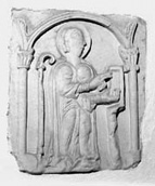 The identification of the figure presents a number of problems. The figure is tonsured and has to the left a crozier and to the right a reading desk. It must, therefore, represent a monk who was also a bishop and possibly an author. Unfortunately, there is no comparable figure in stone, metalwork, or ivory from southern England, and it is necessary to turn to the manuscripts for comparative iconography. These depict five possible candidates: St Gregory; St Benedict; St Aldhelm; St Dunstan; and St Aethelwold.