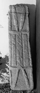 A (top): There is a narrow, low-relief border along the long edges. There is a broad, low-relief median band which bifurcates about a third of the way in from each end. Each pair of bifurcations diverges and runs off the end alongside, but not touching, the borders. Towards the upper end of the median moulding is an incised Latin cross from the lower end of which develops a pair of complete incised lozenges, and half of a third, placed one above the other, and spanning the width of the moulding. From the head of the cross develops a similar lozenge and half of a second. At each point of bifurcation one of a pair of expanding relief mouldings runs from each edge of the median band to the edge of the face, crossing the border.