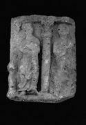 A (side): The surviving portion of the circumference is divided into two equal fields by a three-quarter round column with a damaged base. The damaged capital, separated from the column by a narrow roll moulding, has a pair of outward-facing S-shaped scrolls flanking an upright leaf, from above which springs a pair of scooped volutes linked at the base. Between them is a small, round ended, scooped leaf. Along the left-hand edge of the drum are the mutilated remains of a second similar column. These support a heavily damaged flat entablature, originally of square section, along the upper edge of the drum. In the left-hand field is a heavily damaged, full-length, frontally-placed figure, with its arms held across the body at waist level, and with the feet apart standing on a roughly-indicated ground surface. The figure wears a full-length robe with a folded hem, and an overgarment gathered up from left to right and thrown over the figure's left arm. A similar but more heavily damaged figure occupies the right-hand field.