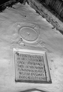 On a sub-rectangular panel is a large circular relief dial delimited by a low relief frame having a median roll moulding. The gnomon hole is represented by an irregular hollow in the centre of the dial, the lower half of which is calibrated. There is a pair of lateral lines, a vertical, and a line mid-way between each lateral and the vertical. Each line is incised, terminates on the frame, and is crossed short of its outer end by an incised line with drilled ends. From the outer edge of the frame develop four plant stems, one running into each of the corners of the panel, and each terminating in a convex-sided, pointed-ended, hollowed leaf. This is flanked by two similar out-turned leaves, the hollows of which are carried down the short stems.