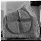 A (broad): The damaged right-hand edge slopes inwards, and the upper edge is broken and rises to the right. The break has partially removed the irregular circle enclosing a Greek cross. Its centre is roughly hollowed.