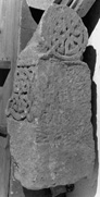 D (narrow): There is a single rectangular panel in the corresponding position to that on face B. This has a plain relief border above, but is damaged to the left, and is filled with an encircled pattern C interlace or ring-knot, with median-incised strands.